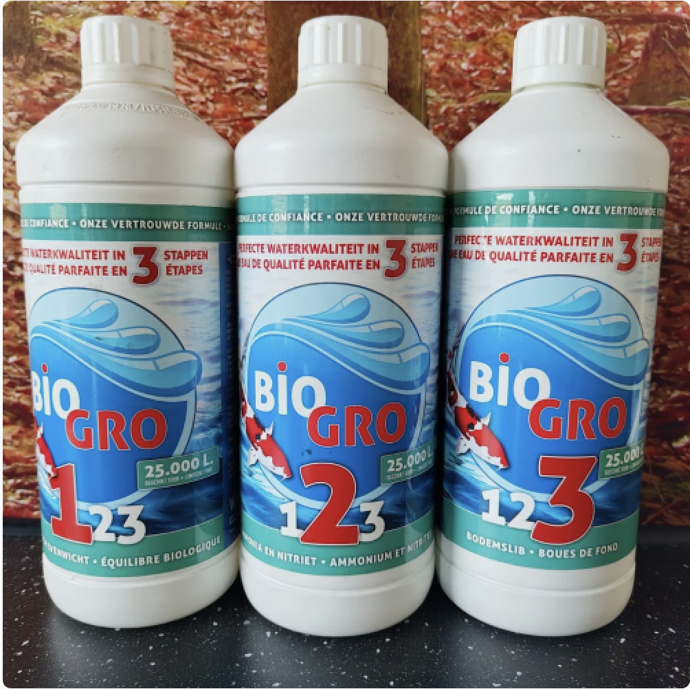 Het unieke BIOGRO 3 stappenplan, bestaat uit 3 producten. Door de speciale formule van BIOGRO, hechten de bacteriën zich beter aan de filtermaterialen. Hierdoor is BIOGRO uitermate geschikt voor (bead)filters, Japanse matten en plastic bedden. BIOGRO 1 Verbetert het biologisch evenwicht in uw vijver. BIOGRO 2 Reduceert de giftige concentraties van ammonia en nitriet. BIOGRO 3 Reduceert het organisch bodemslib.