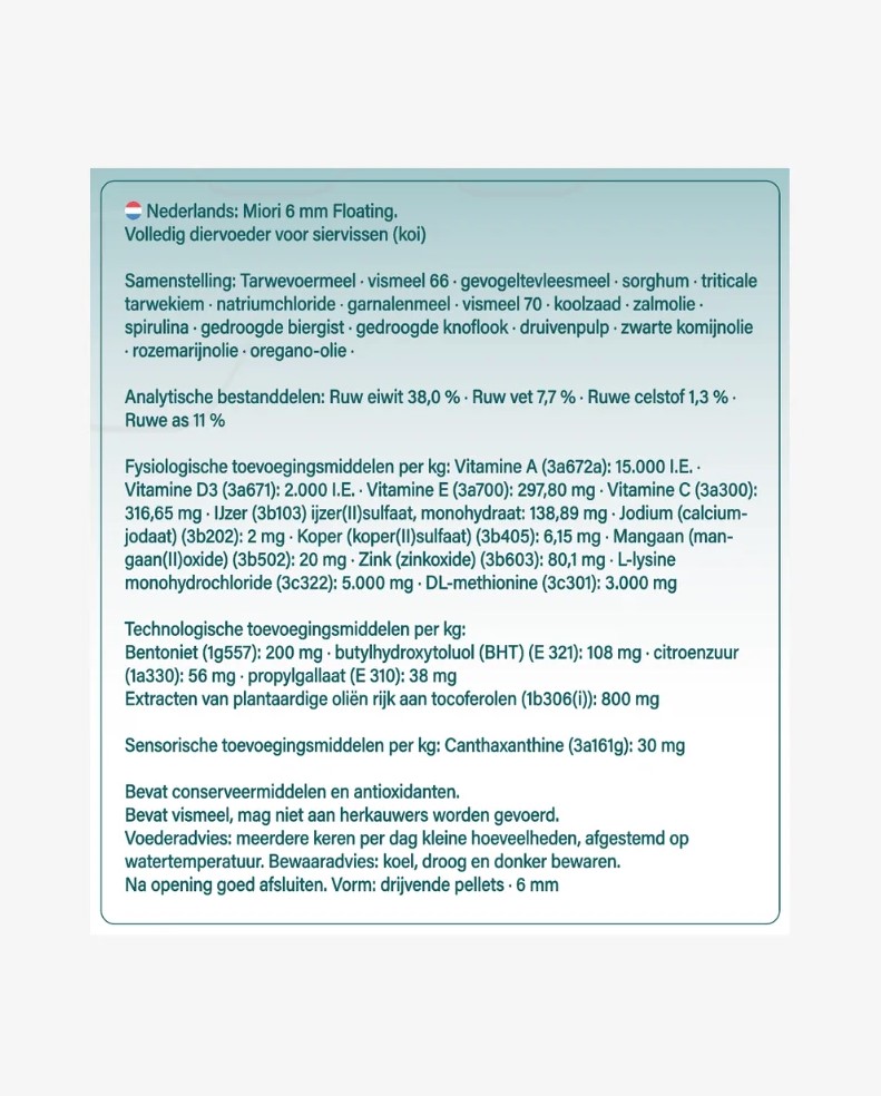KiGen Koivoer Miori 6 mm KiGen Miori is een uitgebalanceerd koivoer voor dagelijkse ondersteuning van groei, kleur en gezondheid. Dankzij de combinatie van hoogwaardig vismeel en gevogeltemeel biedt dit voer een goed opneembare eiwitbron met een lage afvalbelasting van het water. Het voer ondersteunt een gelijkmatige groei, een sterke lichaamsbouw en het behoud van natuurlijke kleuren zoals beni (rood) en shiroji (wit). Een betrouwbare en betaalbare keuze voor iedere koiliefhebber. Drijvende korrel (6 mm) Ondersteunt groei, kleur en vitaliteit Goede verteerbaarheid, minder waterbelasting Verkrijgbaar in 1,2 kg, 5 kg en 10 kg