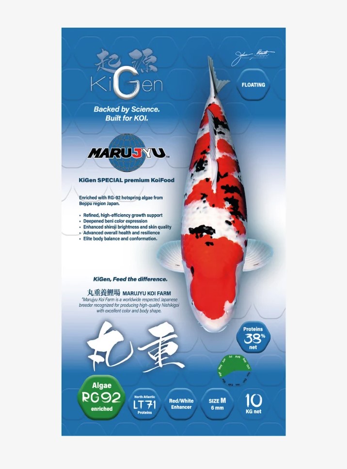 KiGen Marujyu Special is een premium koivoer van de hoogste kwaliteit, speciaal ontwikkeld voor koi-liefhebbers die alleen het beste willen voor hun vissen. Dit geavanceerde voer is verrijkt met RG-92 algen uit de warmwaterbronnen van Beppu (Japan), een uniek ingrediënt dat wereldwijd wordt gebruikt door topkwekers.